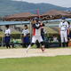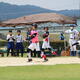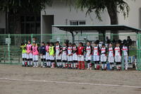 試合開始前にベンチ前で整列し、挨拶。対戦相手は新田暁高校。