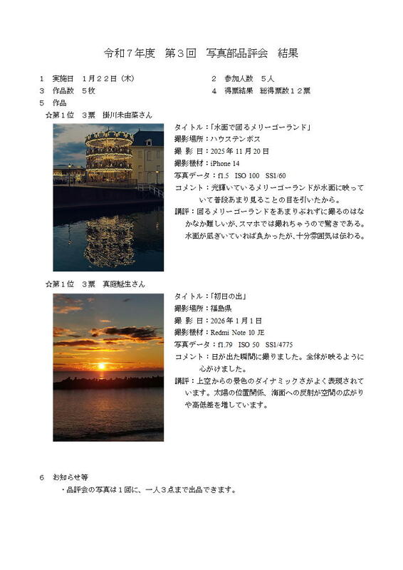 令和7年度 第3回写真品評会 1月22日(木)実施