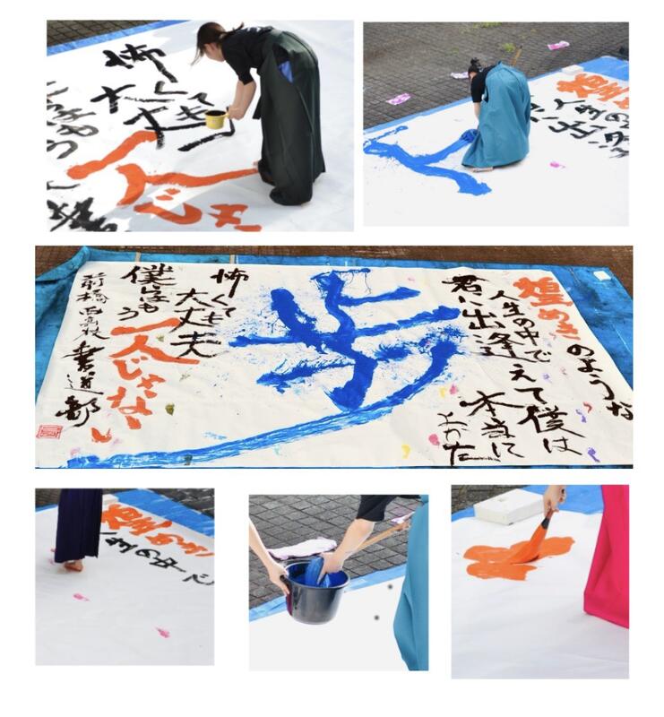 足に絵の具をつけて紙の上を歩き、足跡を残す演出も取り入れながら、青く澄み渡る空の下、部員たちは4m×6mの大作を伸びやかに書き上げました。