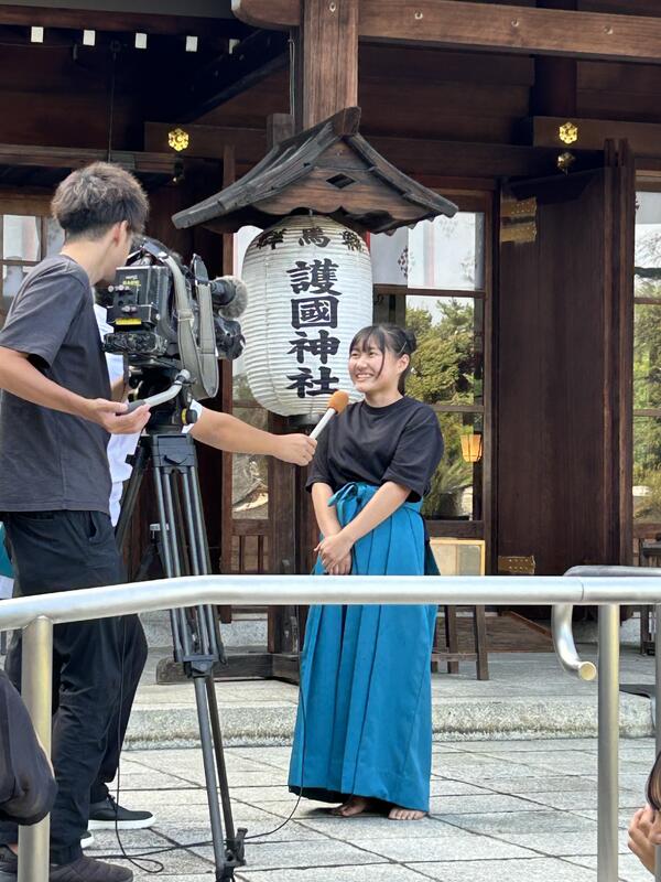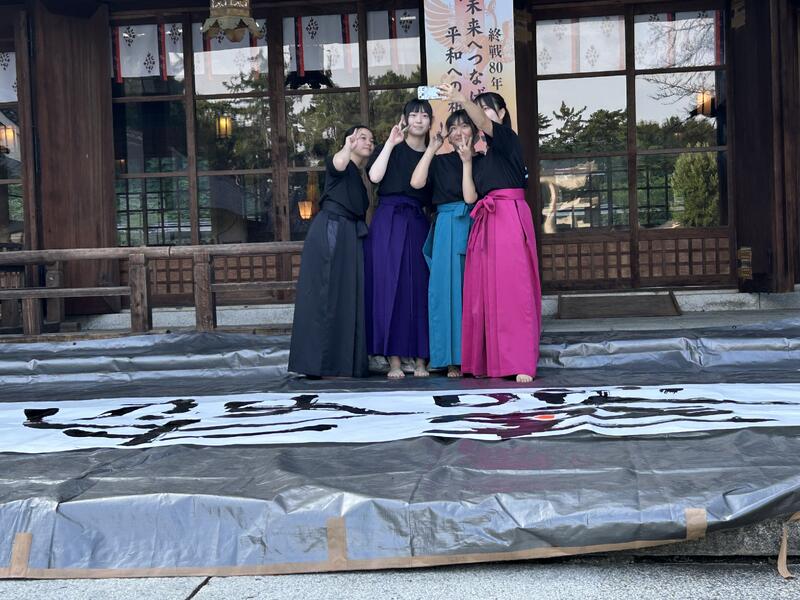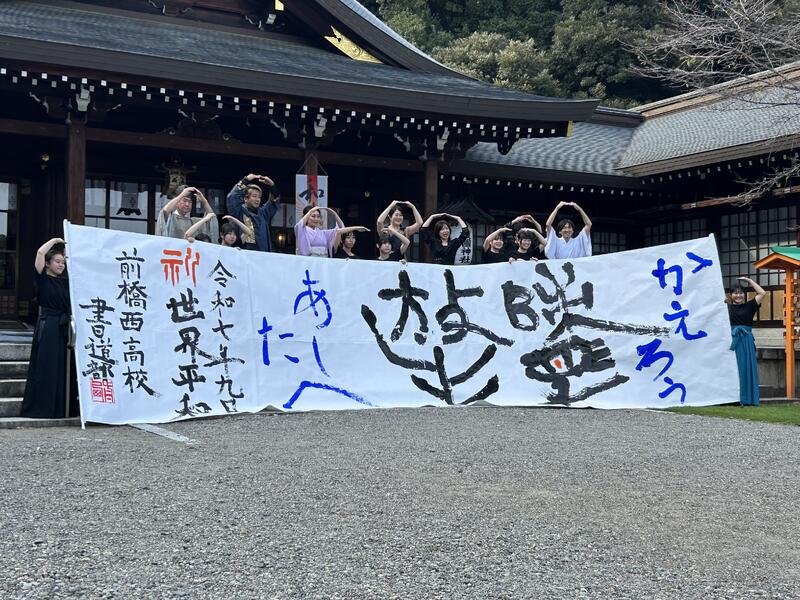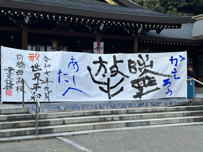 9月23日(火)、高崎市の護國神社で、世界平和と戦災などの被災地の復興を祈るイベントが行われ、前西書道部が書道作品を奉納しました。このイベントは愛知県の団体「和プロジェクトTAISHI」が毎年9月21日の国際平和デーにあわせて開催しています。前西書道部は今年で3年目の参加です。部員8人が長さ8メートルの紙に「帰馬放牛」の四字熟語などを書いて奉納しました。この言葉は、戦争が終わって馬や牛を自然に帰すという意味で、二度と戦争をしないと誓う平和への思いが込められています。中国古代の王朝である殷から周に代わるときの故事に由来する言葉なので、一番古い書体である「篆書」で書きました。この書道作品は年末年始に護國神社に飾っていただいています。ぜひご覧ください。